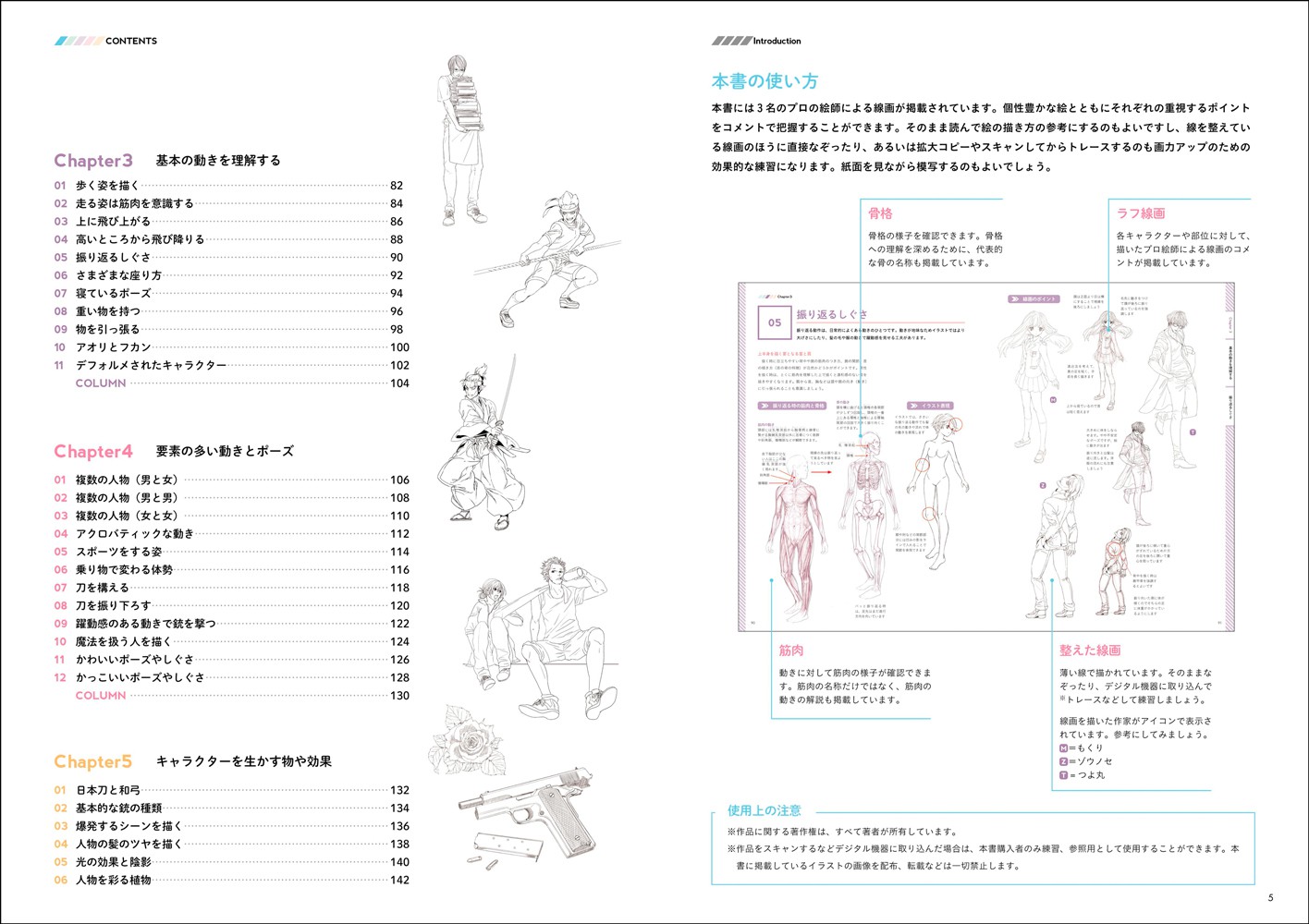本書では、人体の基本構造を細密なリアルイラストで解説しつつ、プロとして活躍中の3人の絵師にさまざまなテーマに沿ってキャラクターの線画を描き下ろしていただきました。