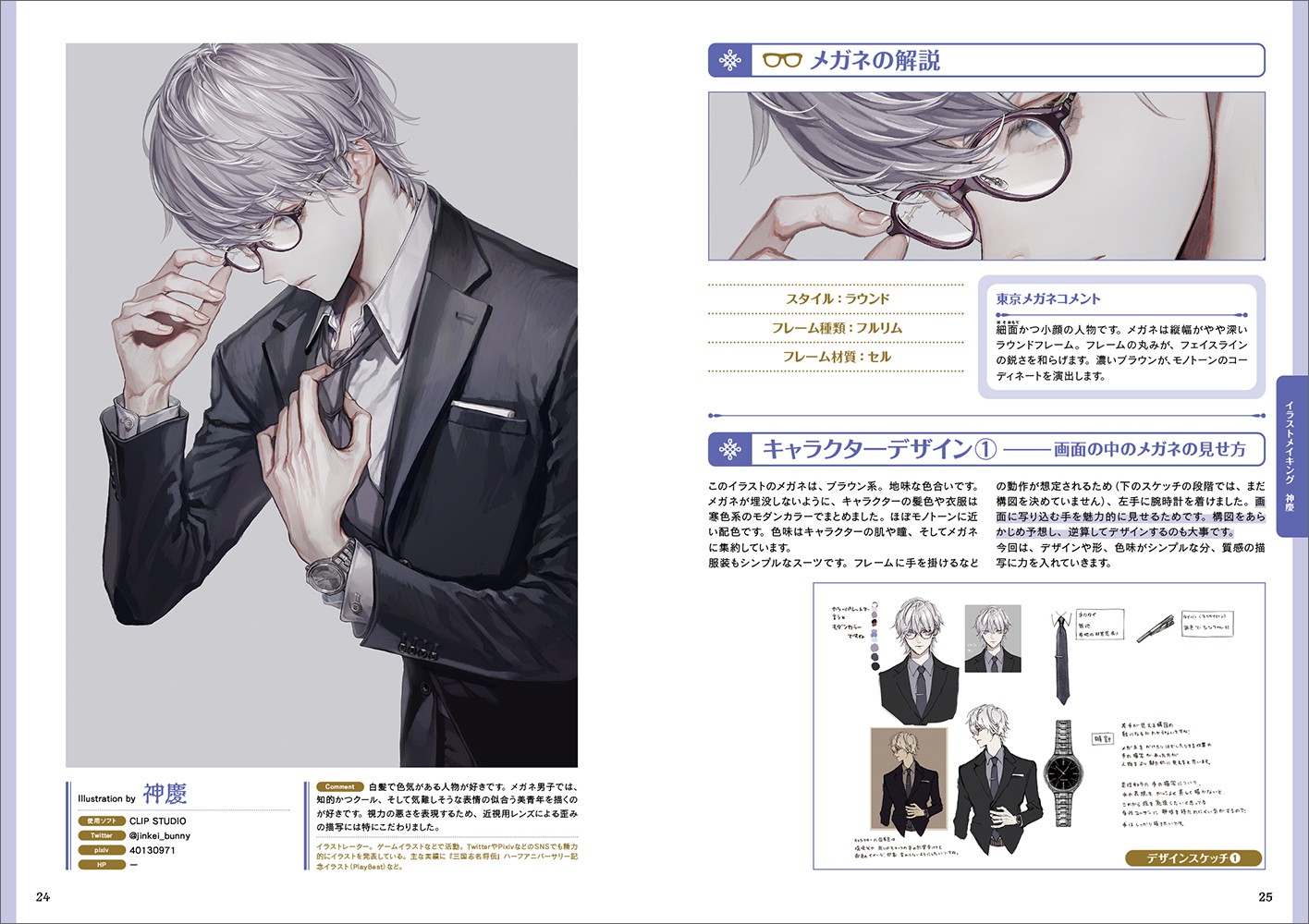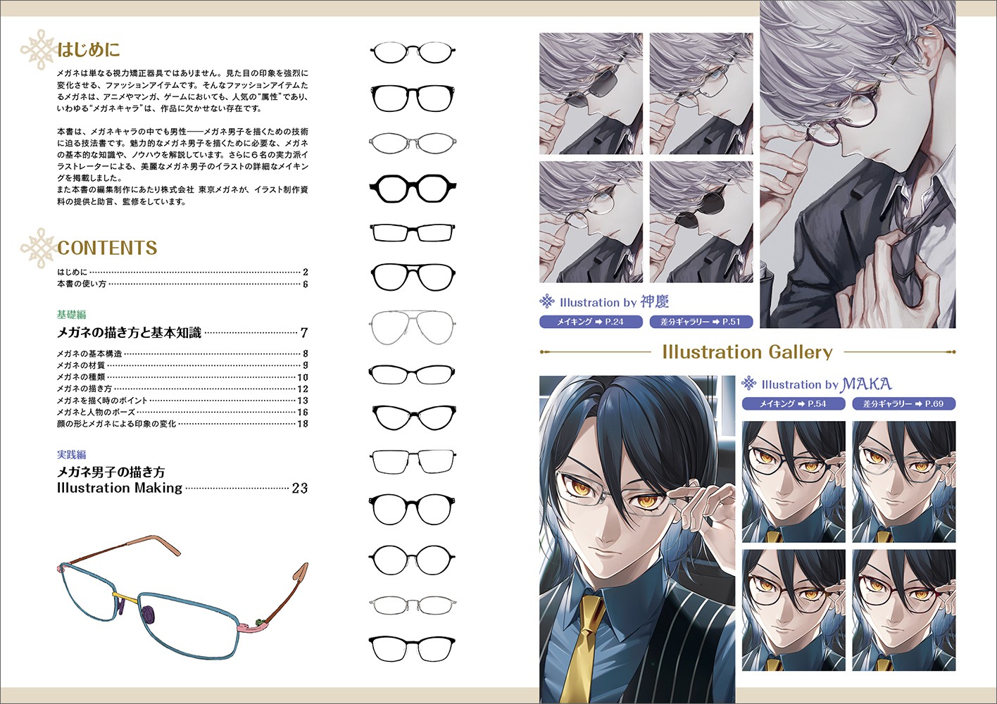 本誌は、特に眼鏡をかけた男性キャラクターにフォーカスした技法書となります。多数の眼鏡のバリエーションを解説するとともに、イラストレーターによるカラーイラストとそのメイキングを複数掲載。イラストにはさらに複数の眼鏡差分も用意し、眼鏡の違いによるキャラクターの印象の変化を解説します。差分によって多数のイラストが掲載されることから、「メガネ男子」画集としても楽しめるます。