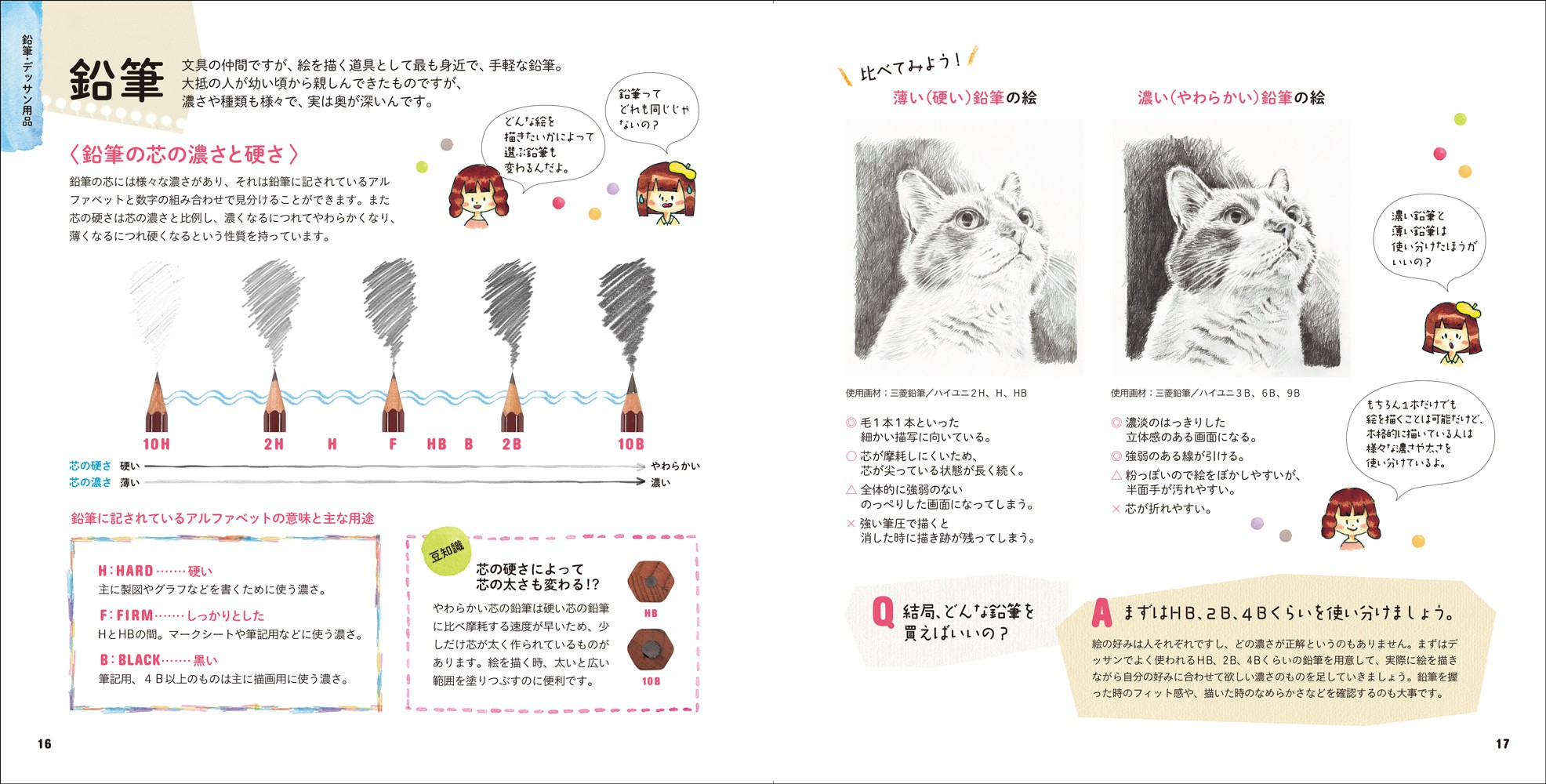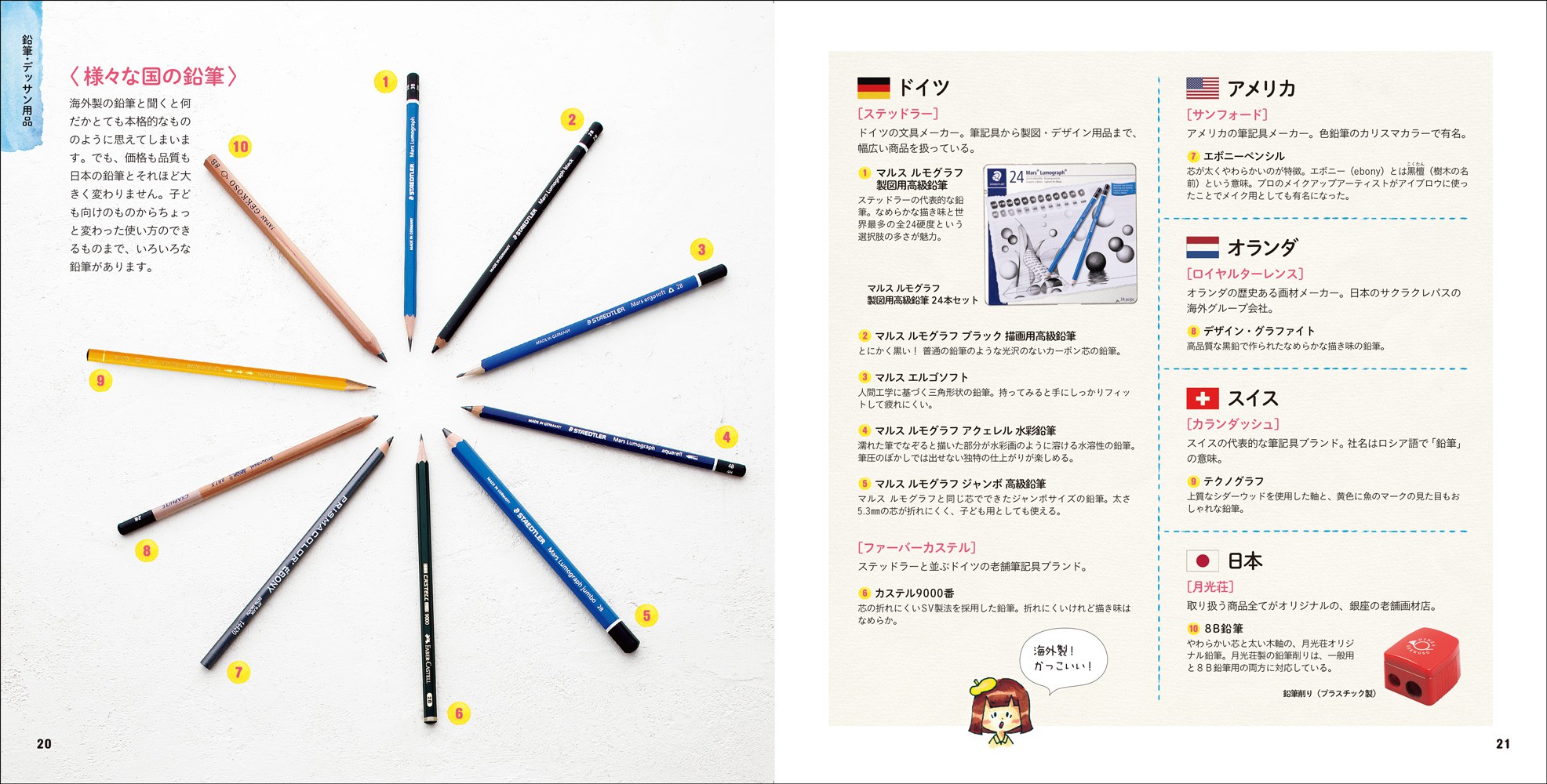 デッサン用品から日本画絵具、額まで幅広く、画材好きなら眺めるだけでも楽しめます。基本的な使い方も紹介しているので、新しいことを試してみたい人にもぴったりです。