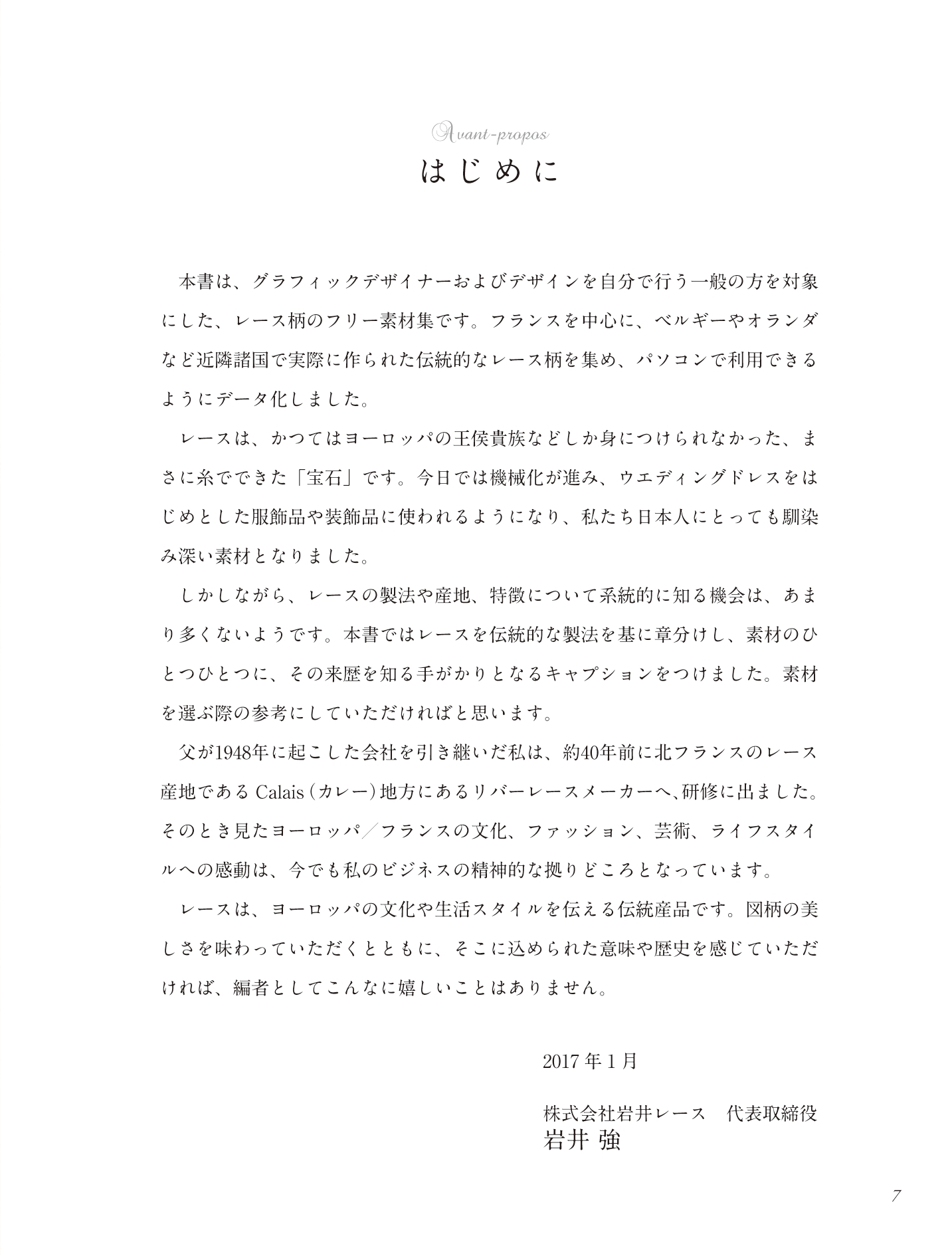 本書は、フリーのレース素材の写真や図版を収録した本とDVD-ROMをセットにし、グラフィックデザイナーやイラストレーターが本やポスターを制作する際に利用できるようにした「素材集」です。