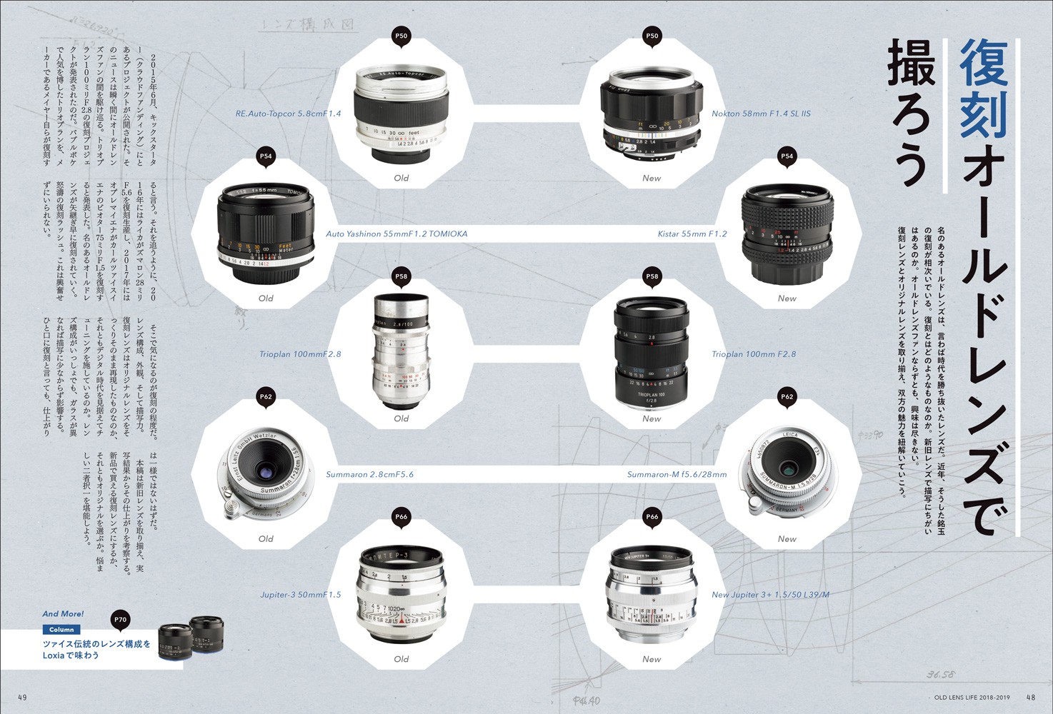 「オールドレンズ・ライフ」シリーズ8冊目となる2018-2019年度版です。個性的な中望遠レンズを紹介した「キャラ立ちする中望遠レンズ」。名レンズの復刻版と旧レンズを比較する「復刻オールドレンズで撮ろう」。広角レンズによる色かぶりと周辺像の流れを検証する「α7III名広角レンズ十番勝負」。工具不要で簡単にレンズが改造できる「オールドレンズ プチDIYのススメ」など、オールドレンズファン垂涎の企画が盛りだくさんです。