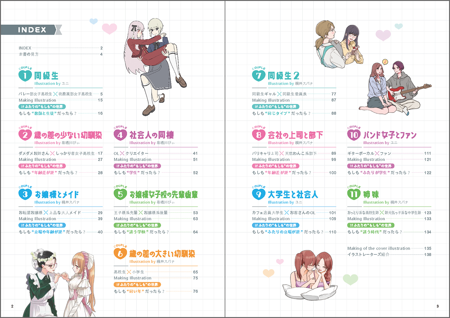 かしわぎつきこ先生が表紙カバーのカップリングを描き、さらにユニ先生、有栖川びぃ先生、梶井スパナ先生、それぞれが描く、11組のカップリングごとに、シチュエーションの異なる様々なイラストを掲載。バックグラウンドとなる二人の関係性やシチュエーションを紹介するとともに、イラストのメイキングを公開します。