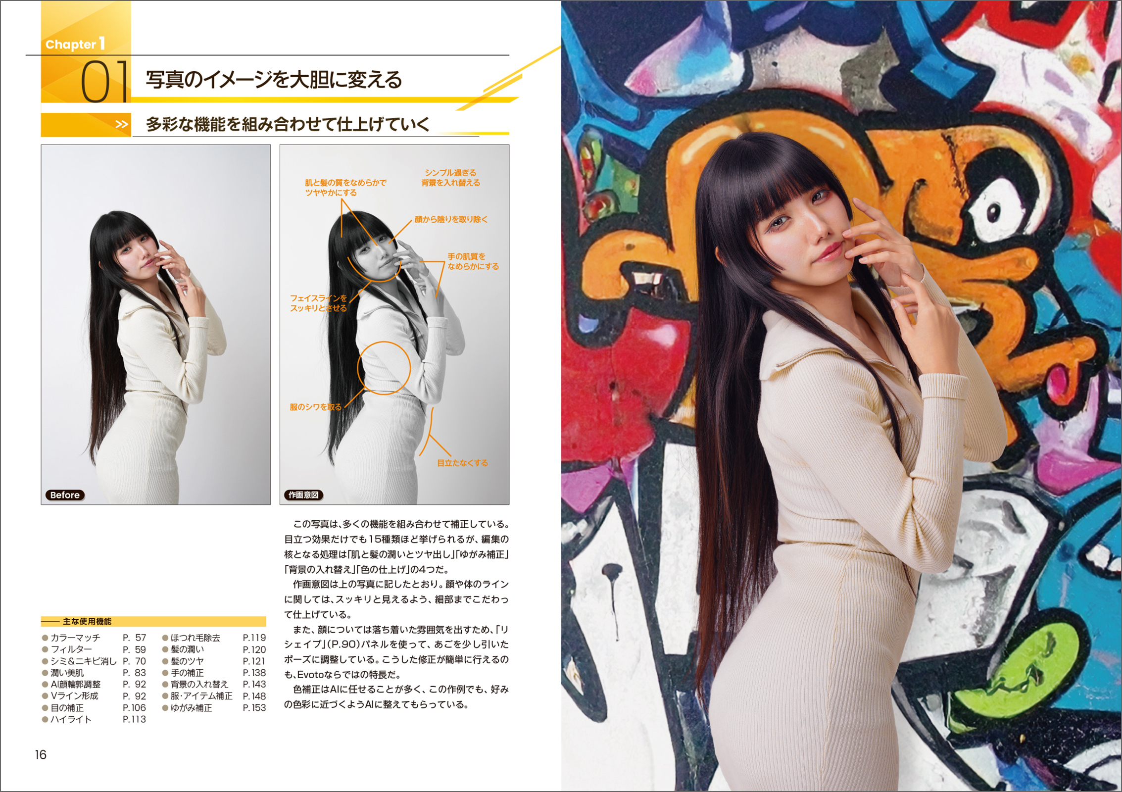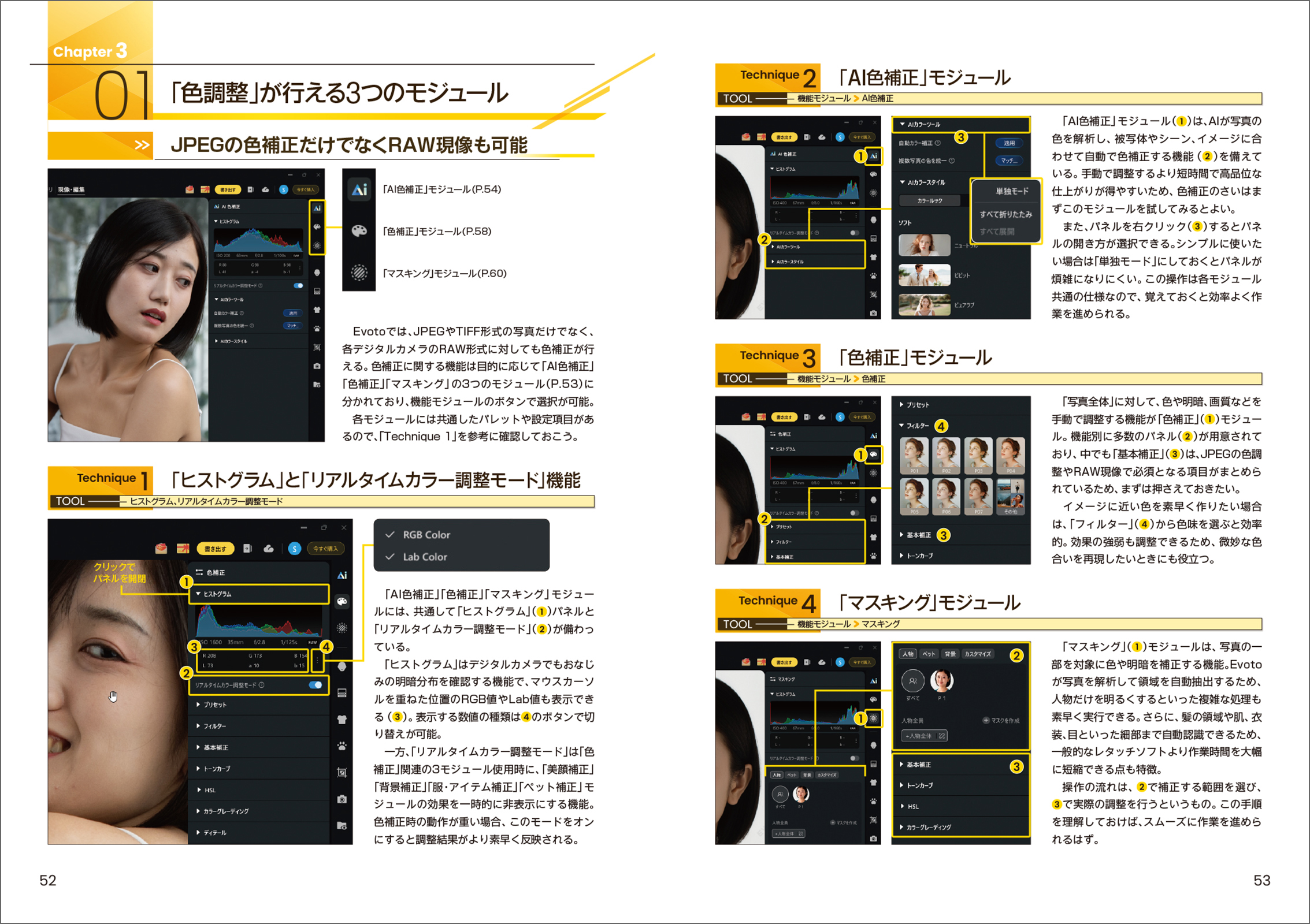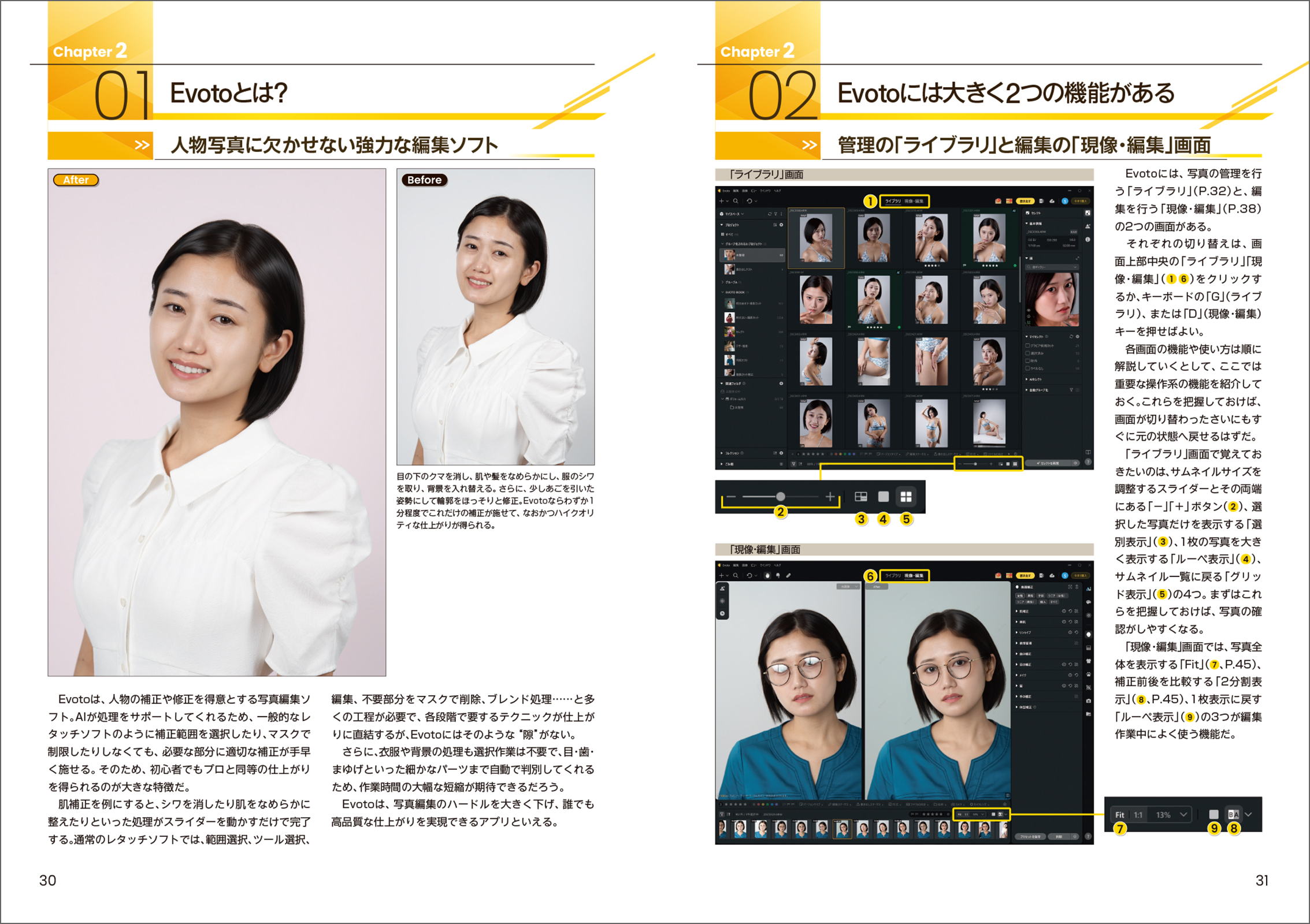 人物の複雑で時間がかかるレタッチを短時間で自然にレタッチできる人気アプリ「Evoto」の入門解説書。導入方法から実践的な補正方法まで、Evotoの基本的なツールを使いこなせるようになる公式ガイドブックです。人物撮影を行うすべてのフォトグラファーのレタッチの悩みを解消する1冊です。